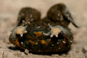Son nom scientifique est Bombina variegata, et on le connait aussi sous le nom de sonneur aux pieds épais.